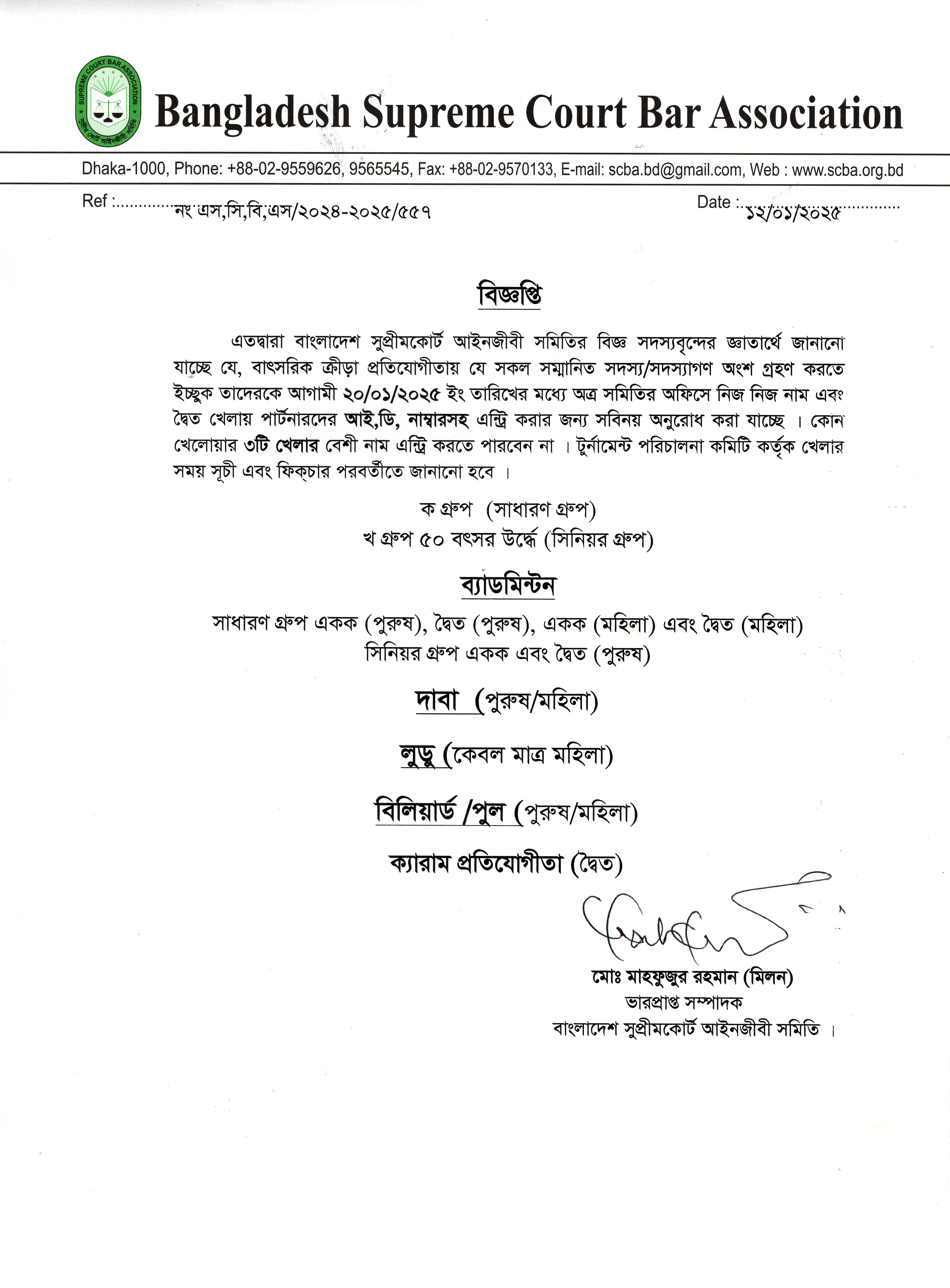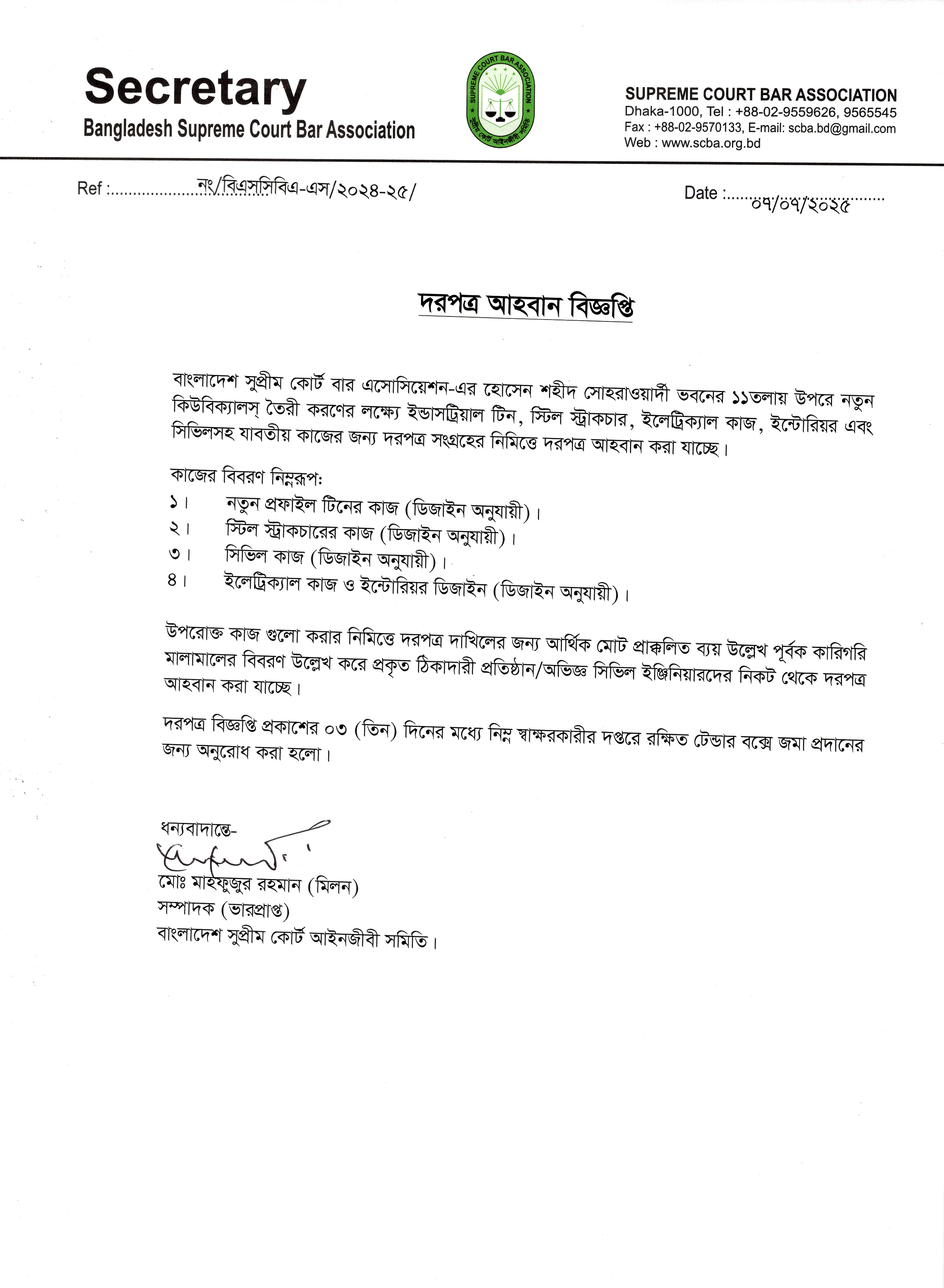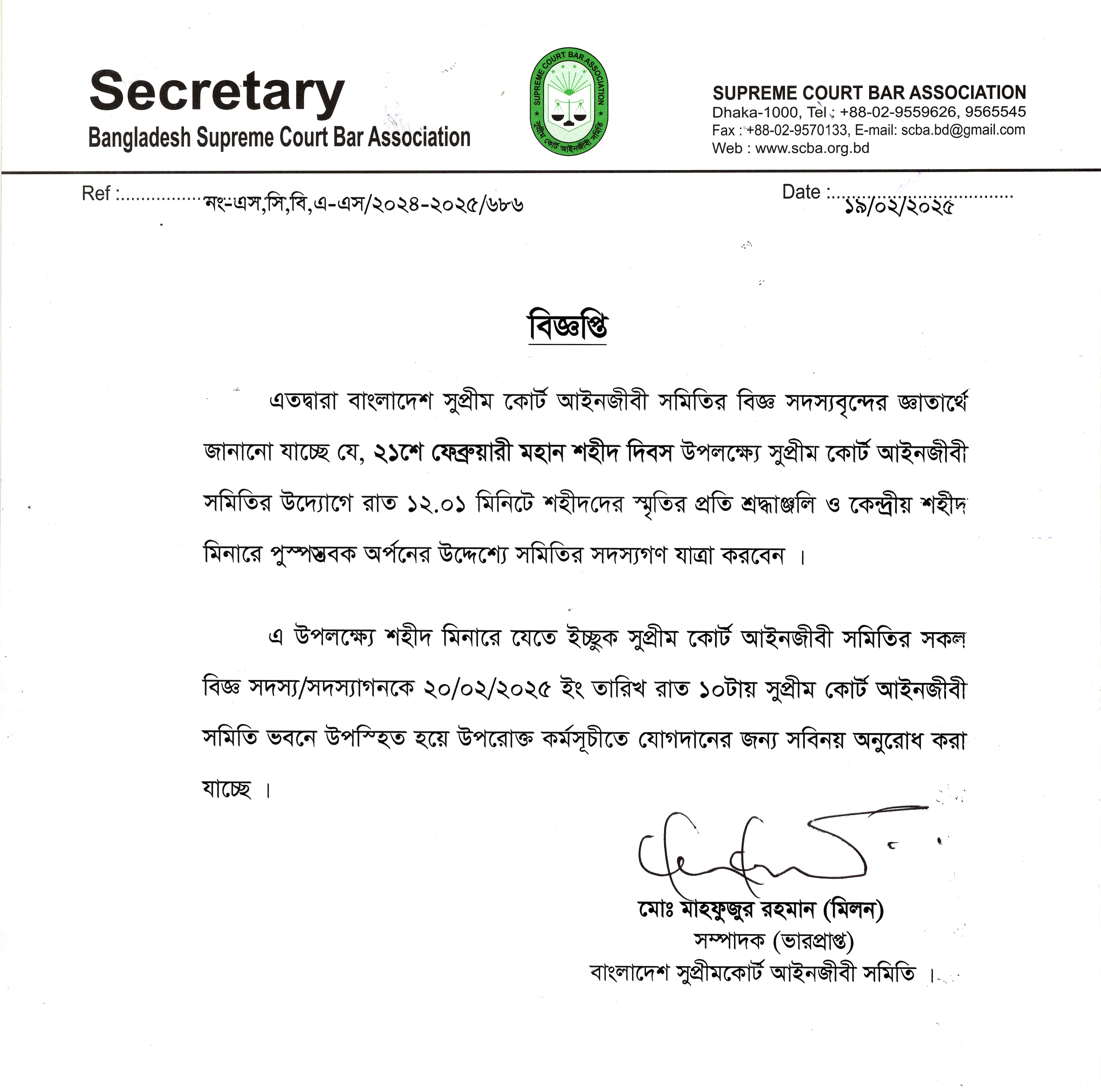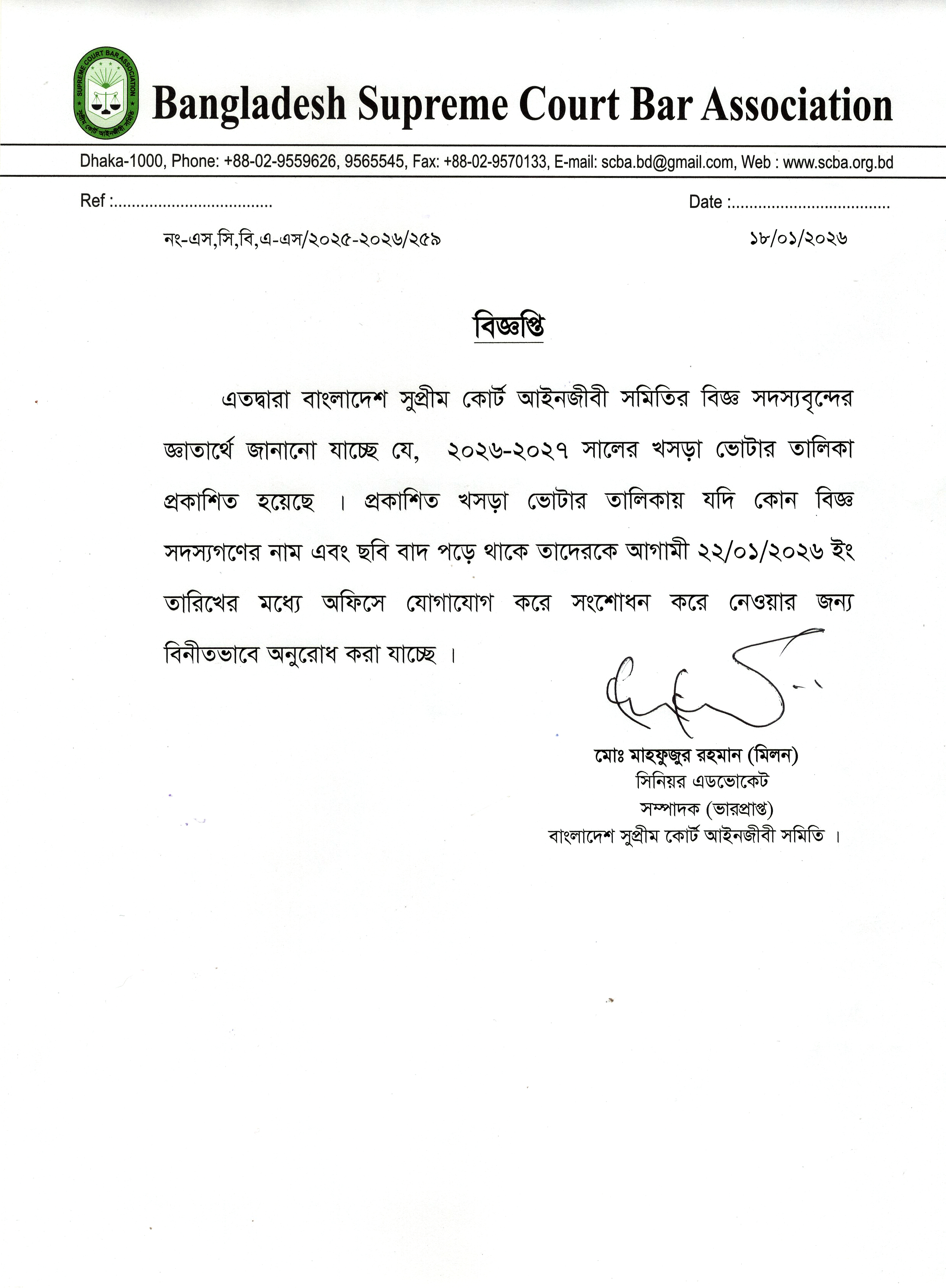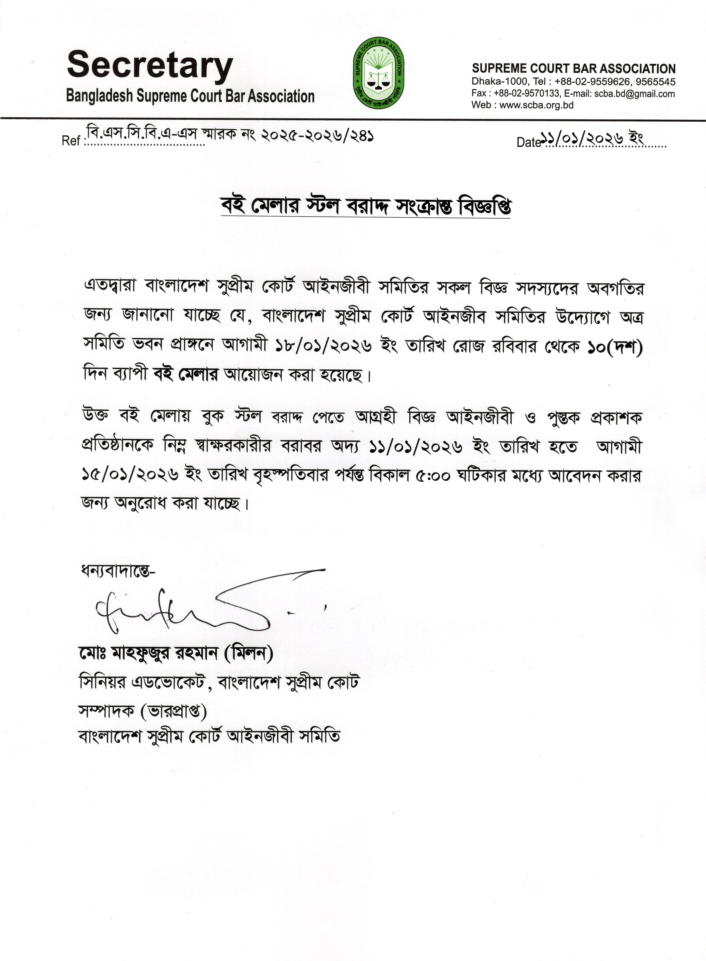 Message From the Secretary (Acting)It is a great pleasure on my part as Secretary, Bangladesh Supreme Court Bar Association to see the website. As an integral part of the Global Village we feel proud of being attached with the device..... Read More