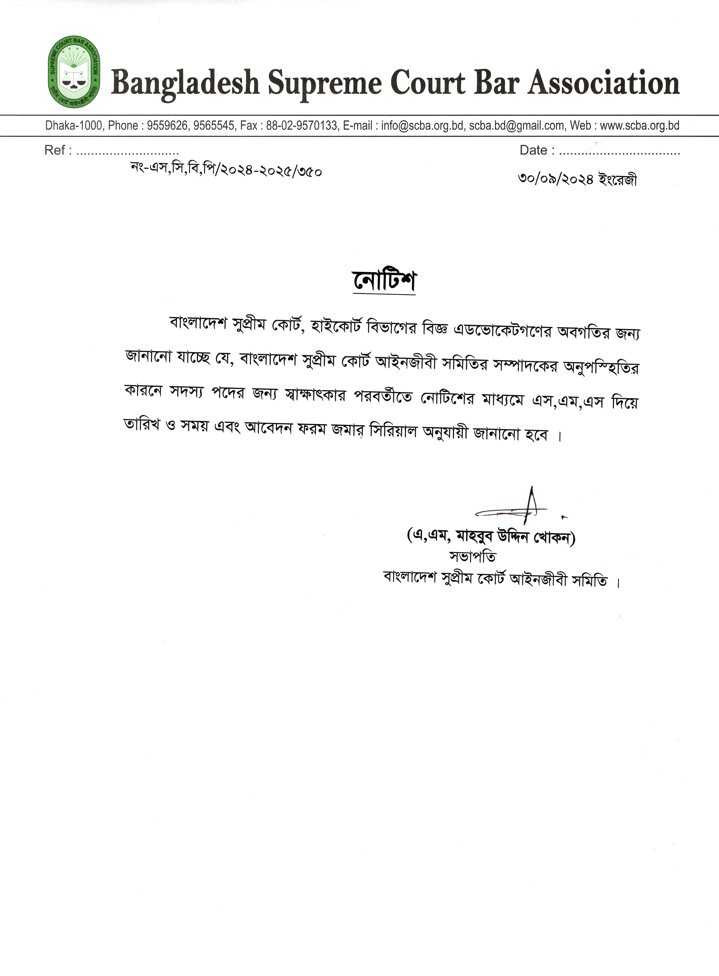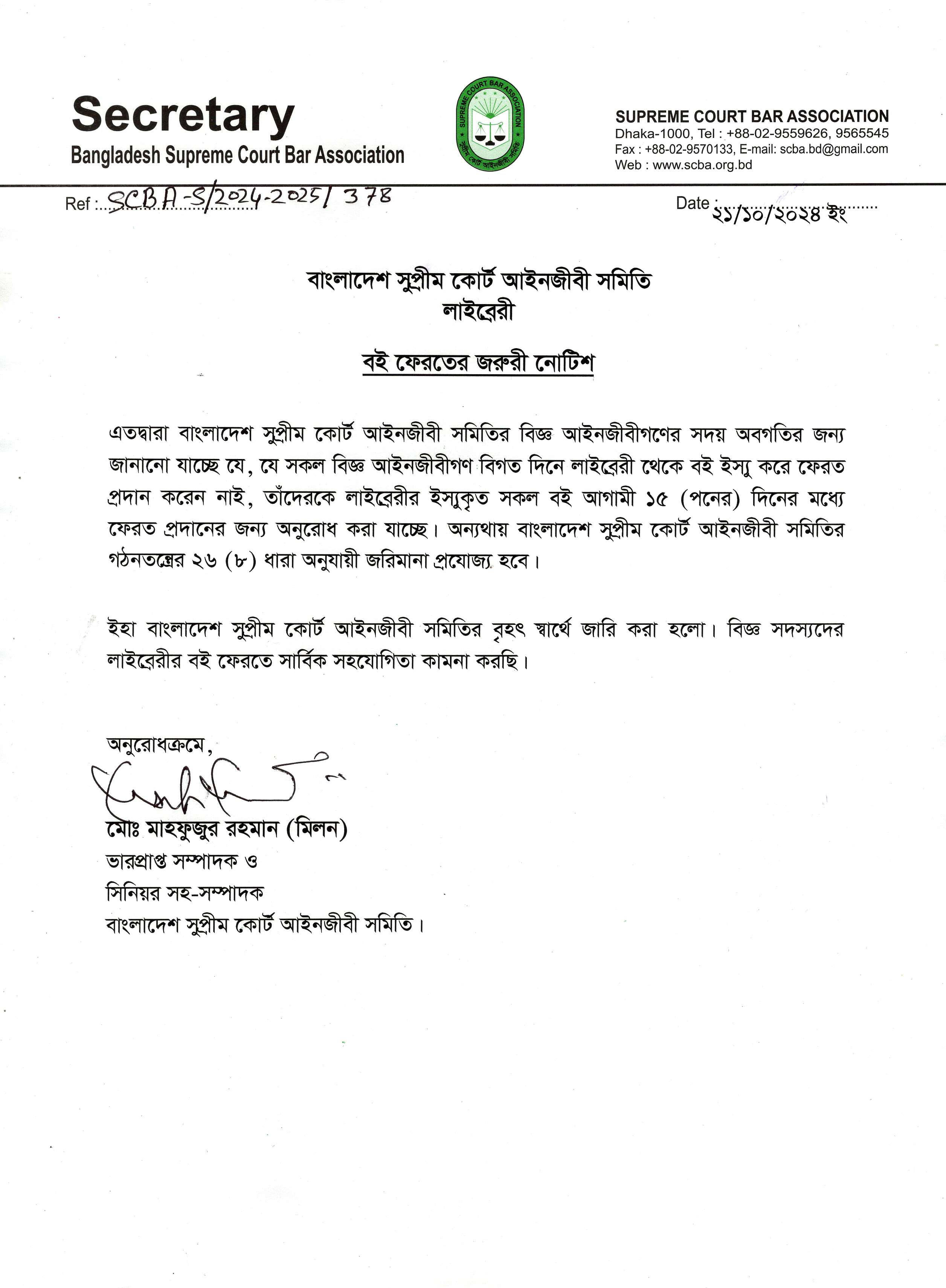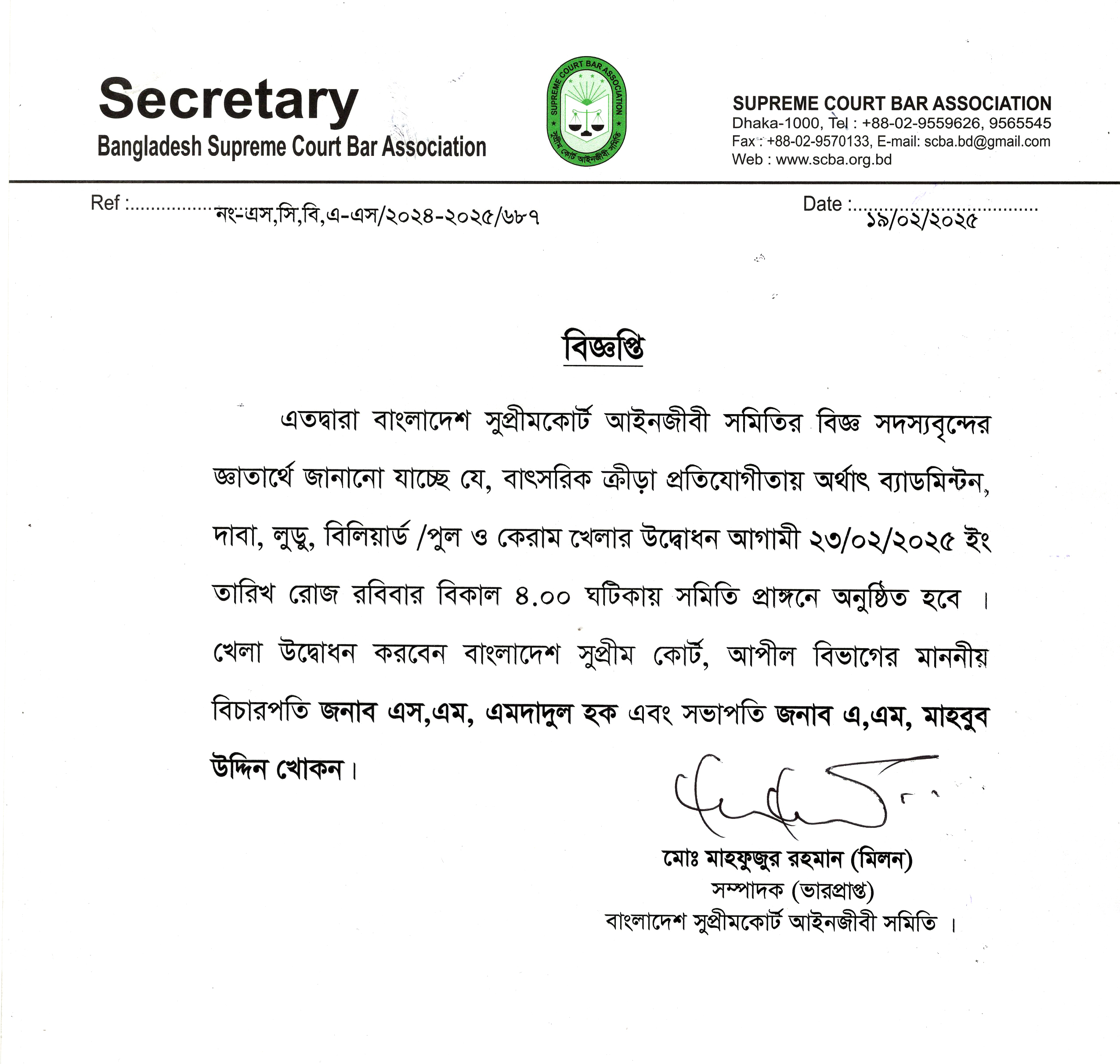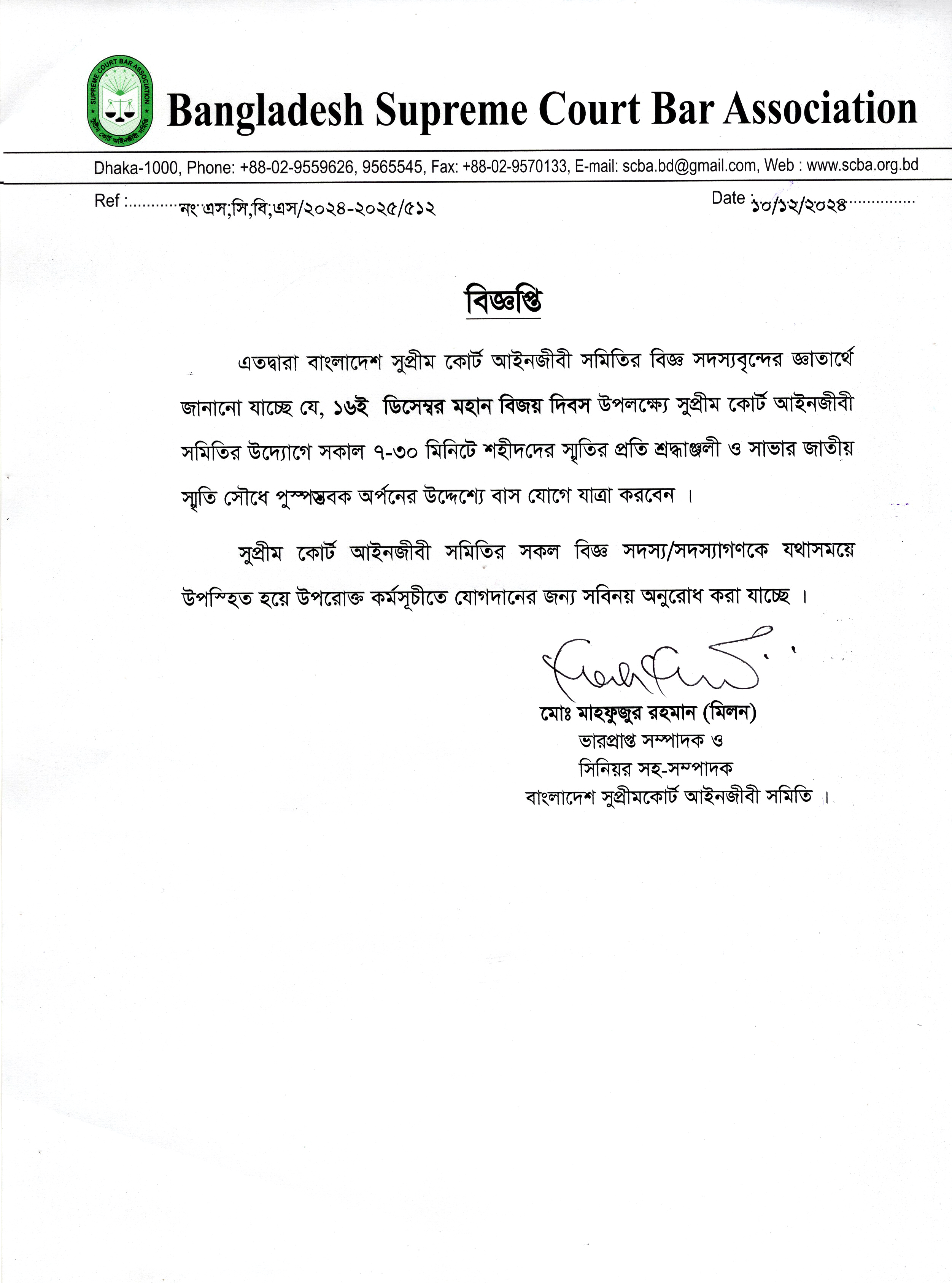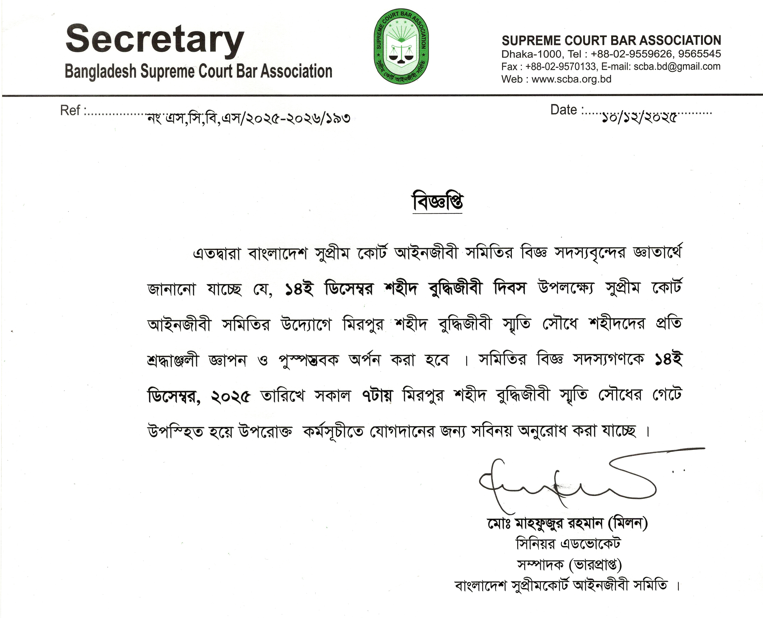 Message From the Secretary (Acting)It is a great pleasure on my part as Secretary, Bangladesh Supreme Court Bar Association to see the website. As an integral part of the Global Village we feel proud of being attached with the device..... Read More