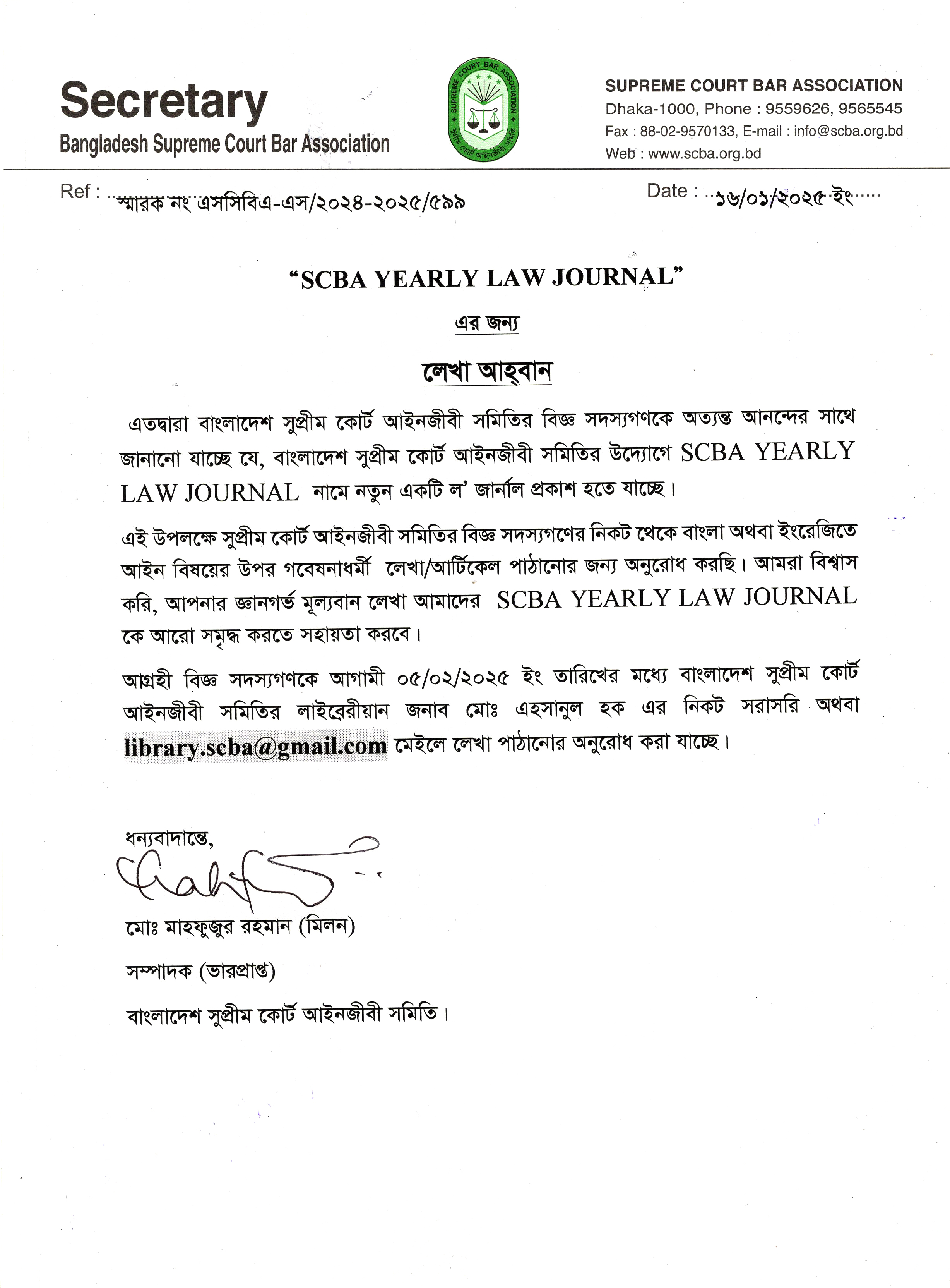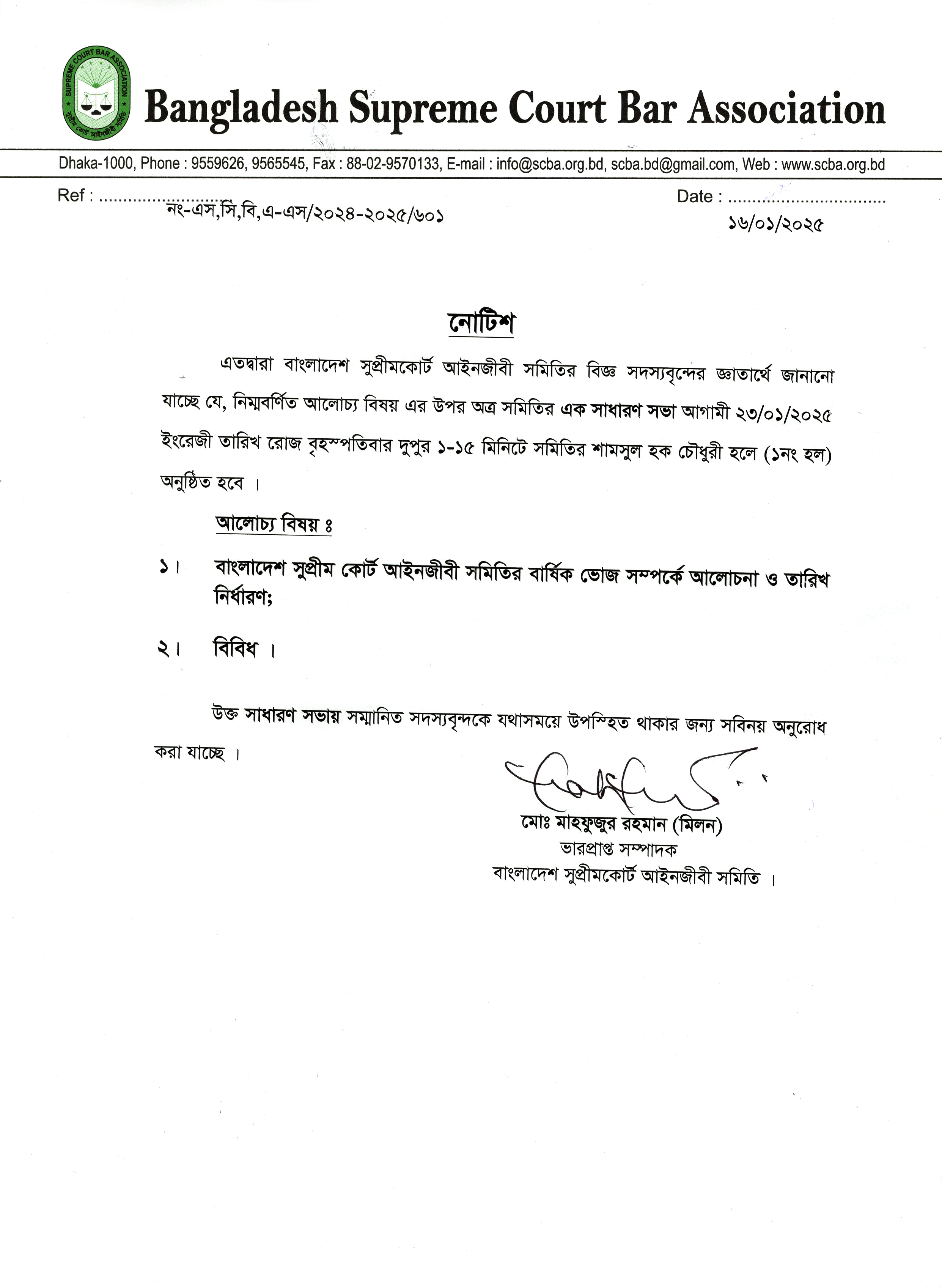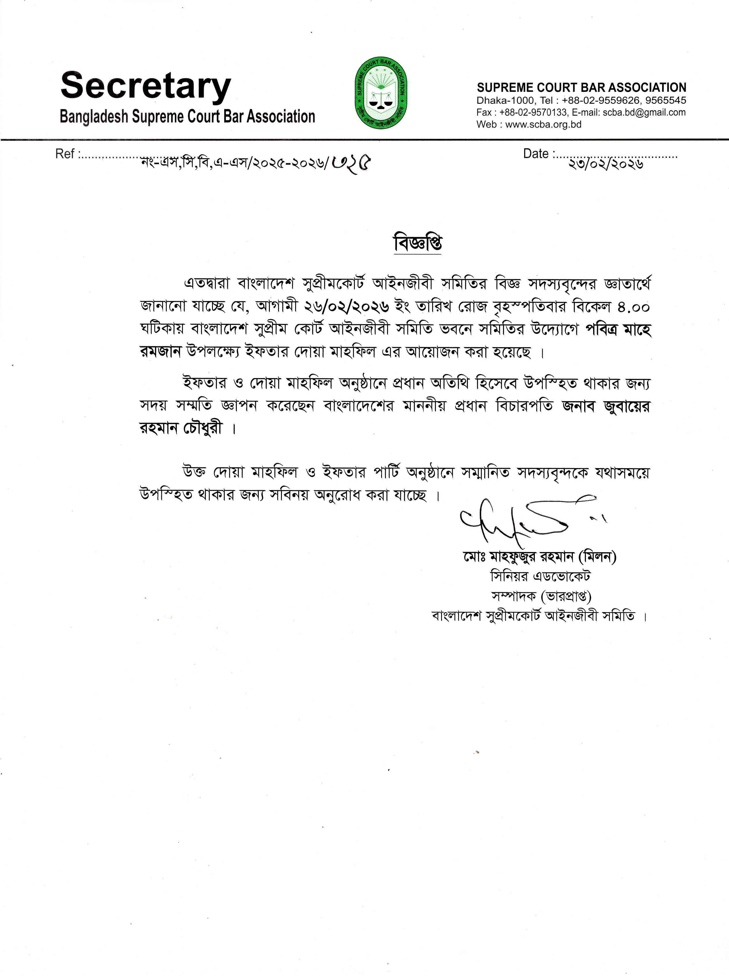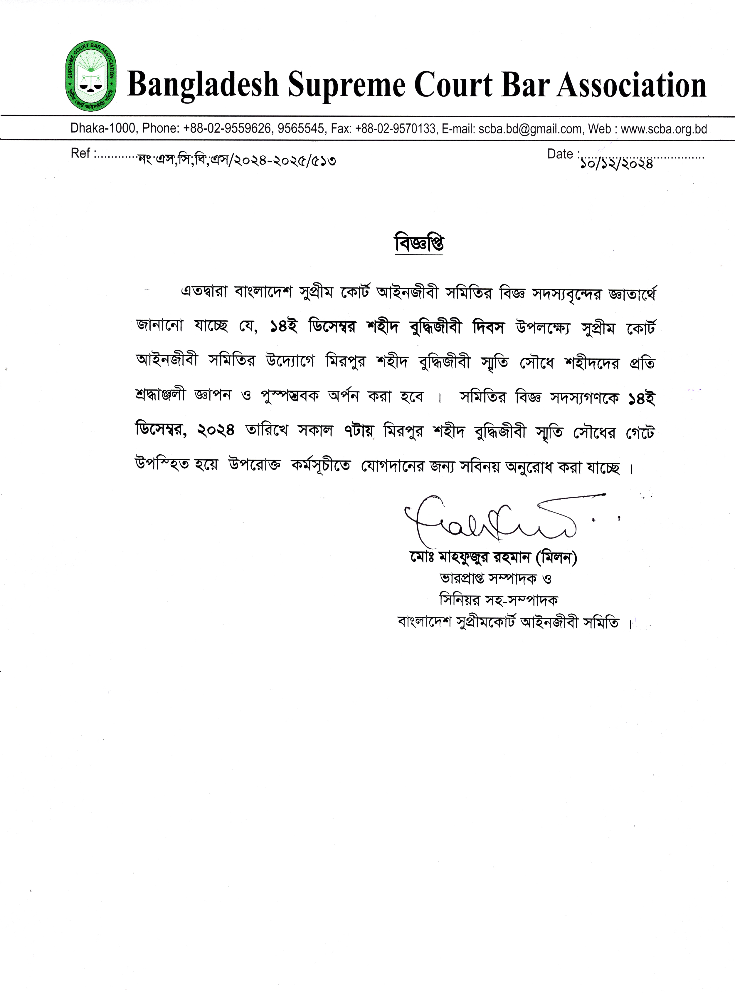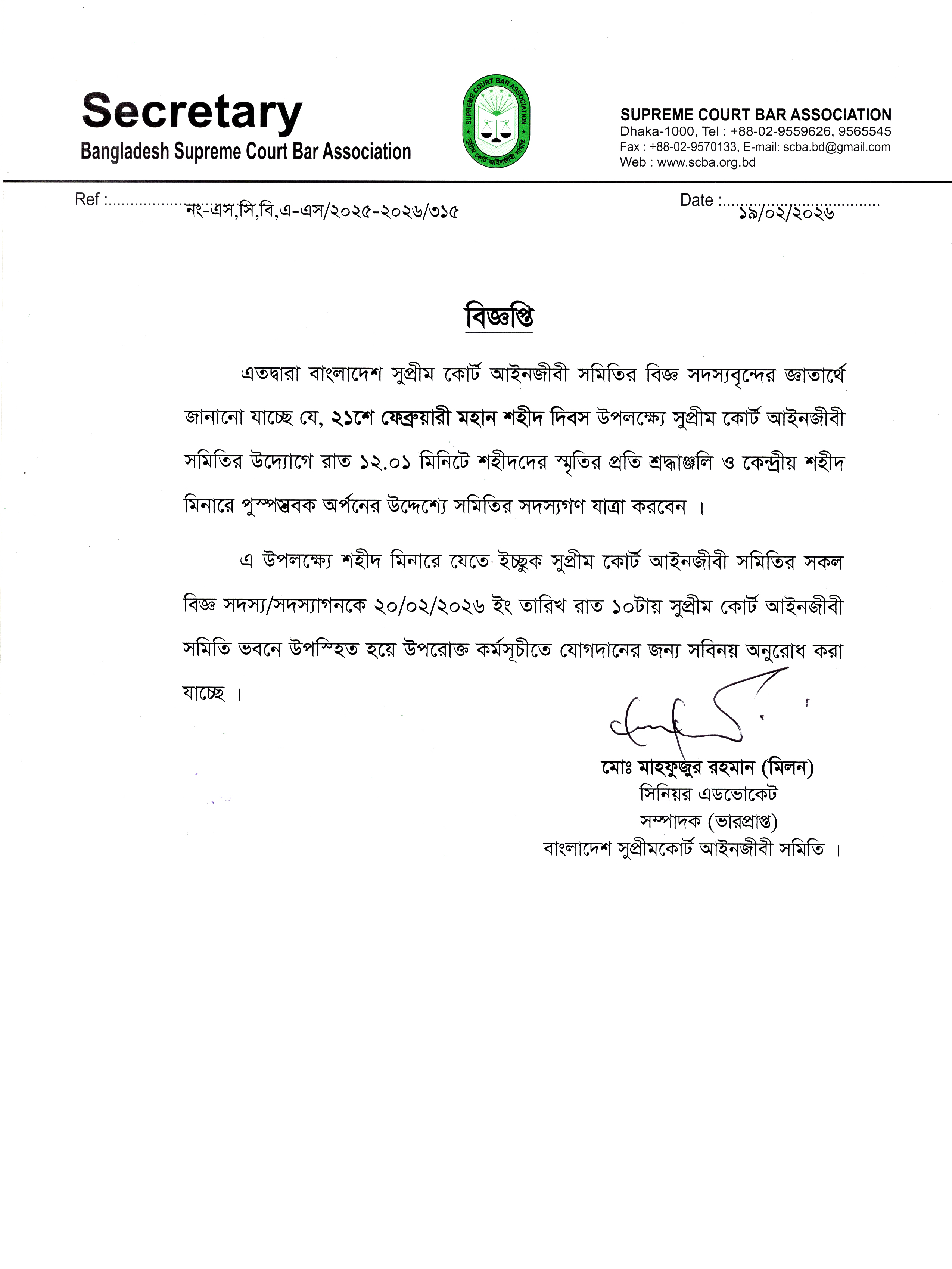 Message From the Secretary (Acting)It is a great pleasure on my part as Secretary, Bangladesh Supreme Court Bar Association to see the website. As an integral part of the Global Village we feel proud of being attached with the device..... Read More