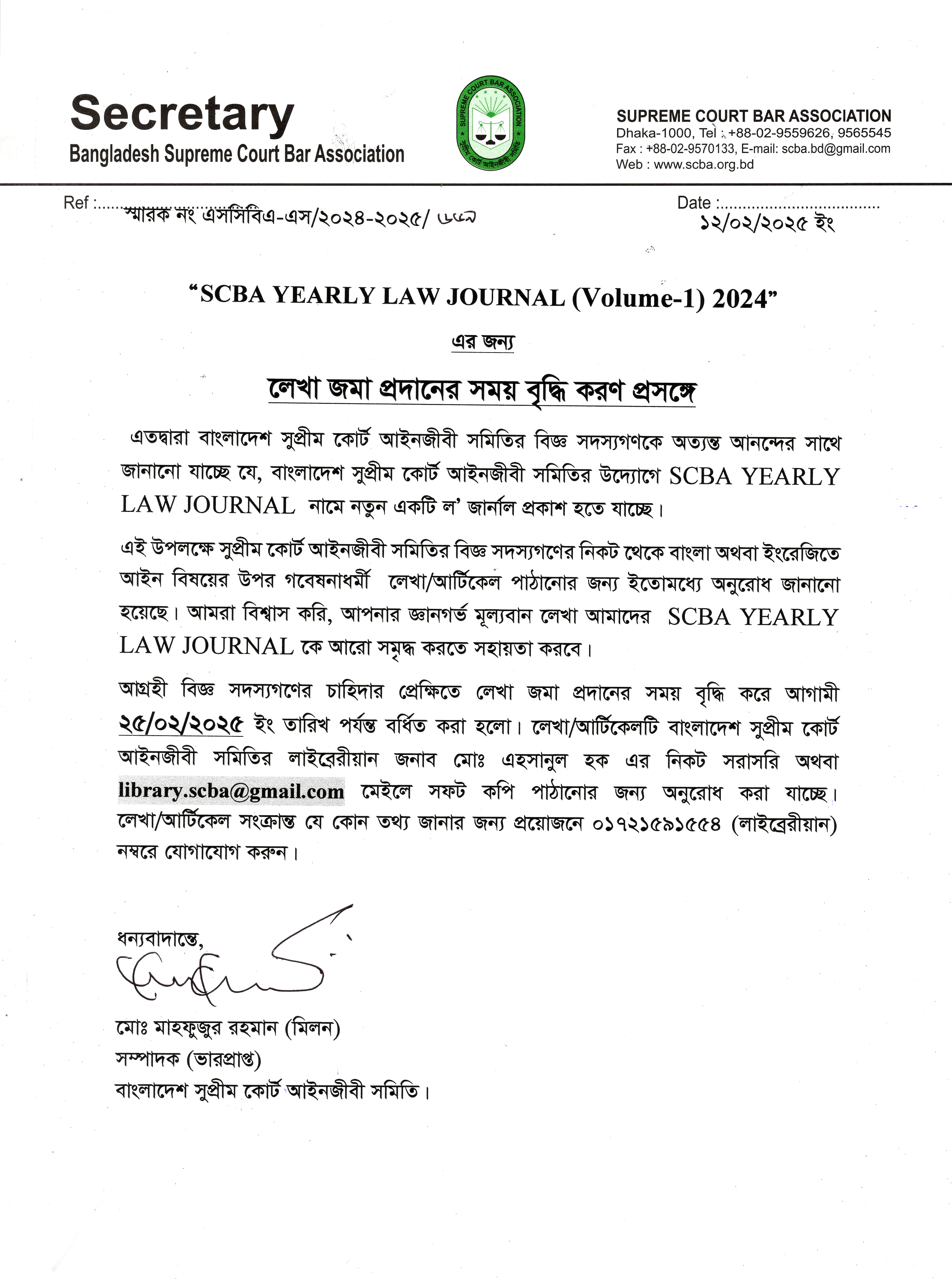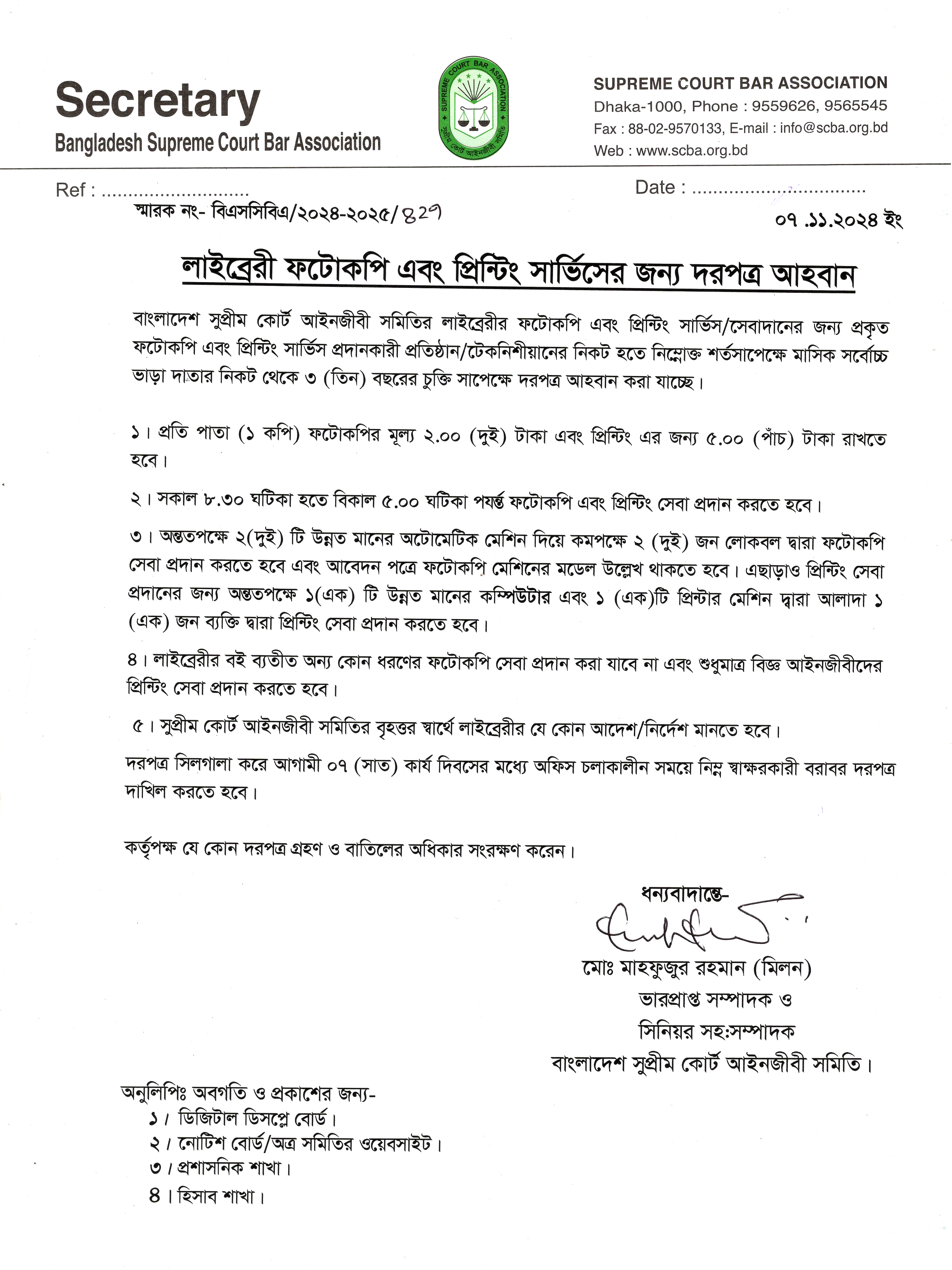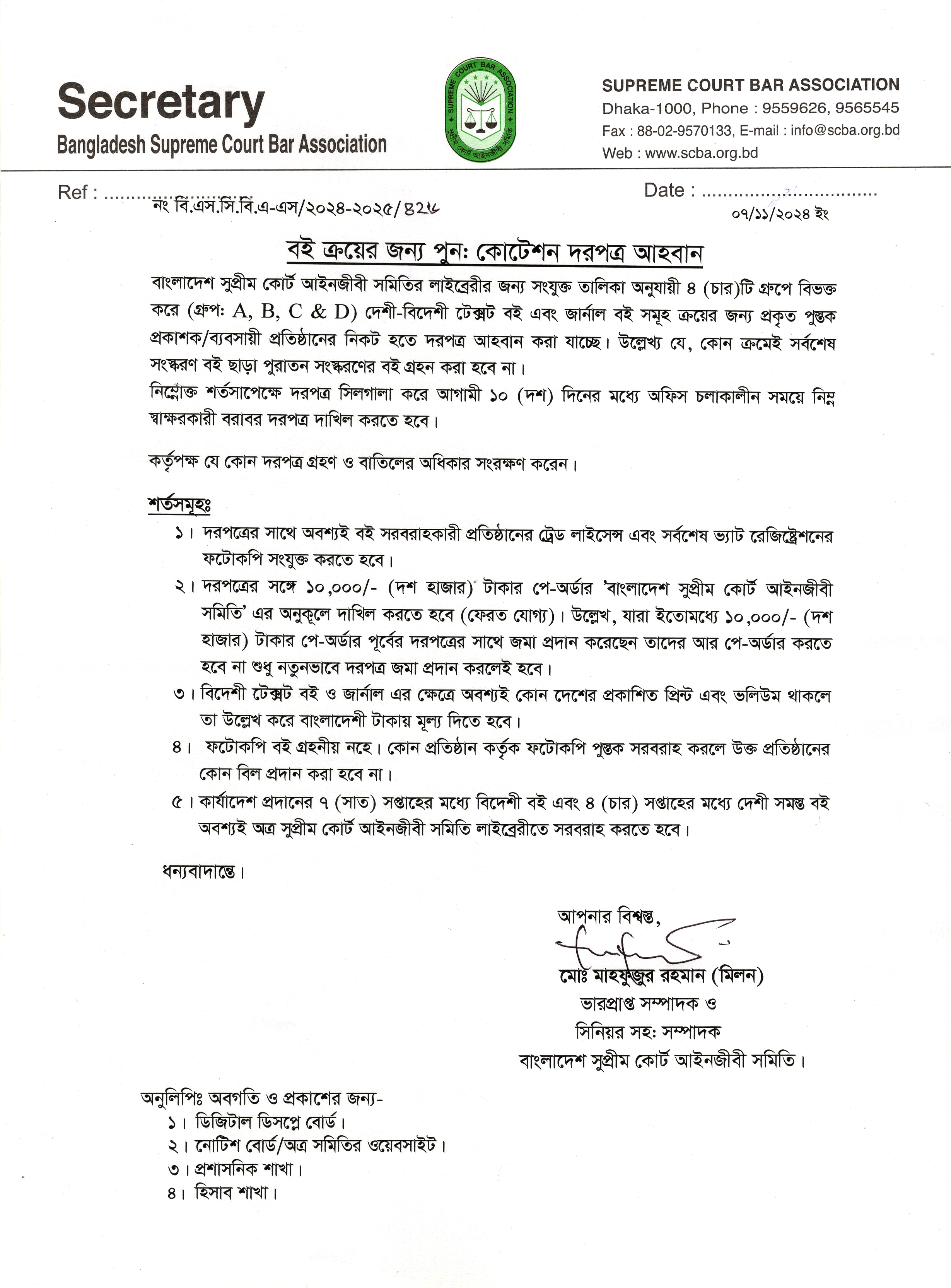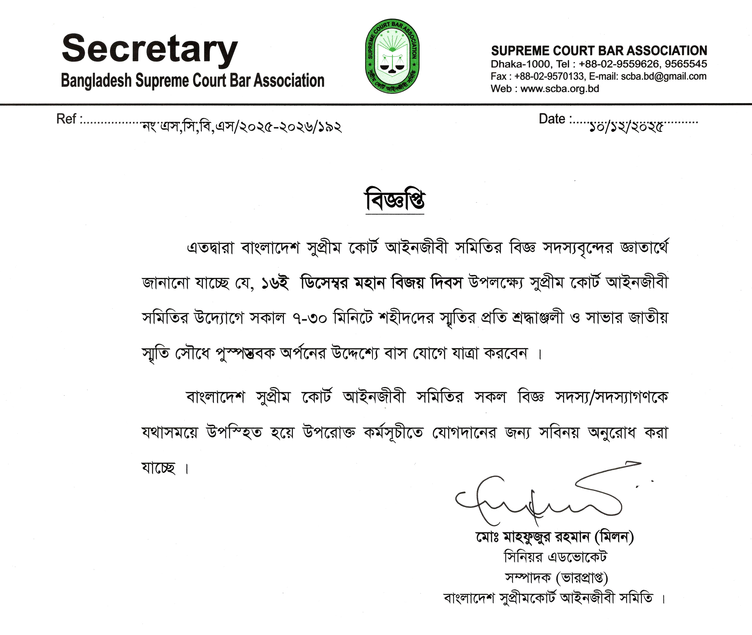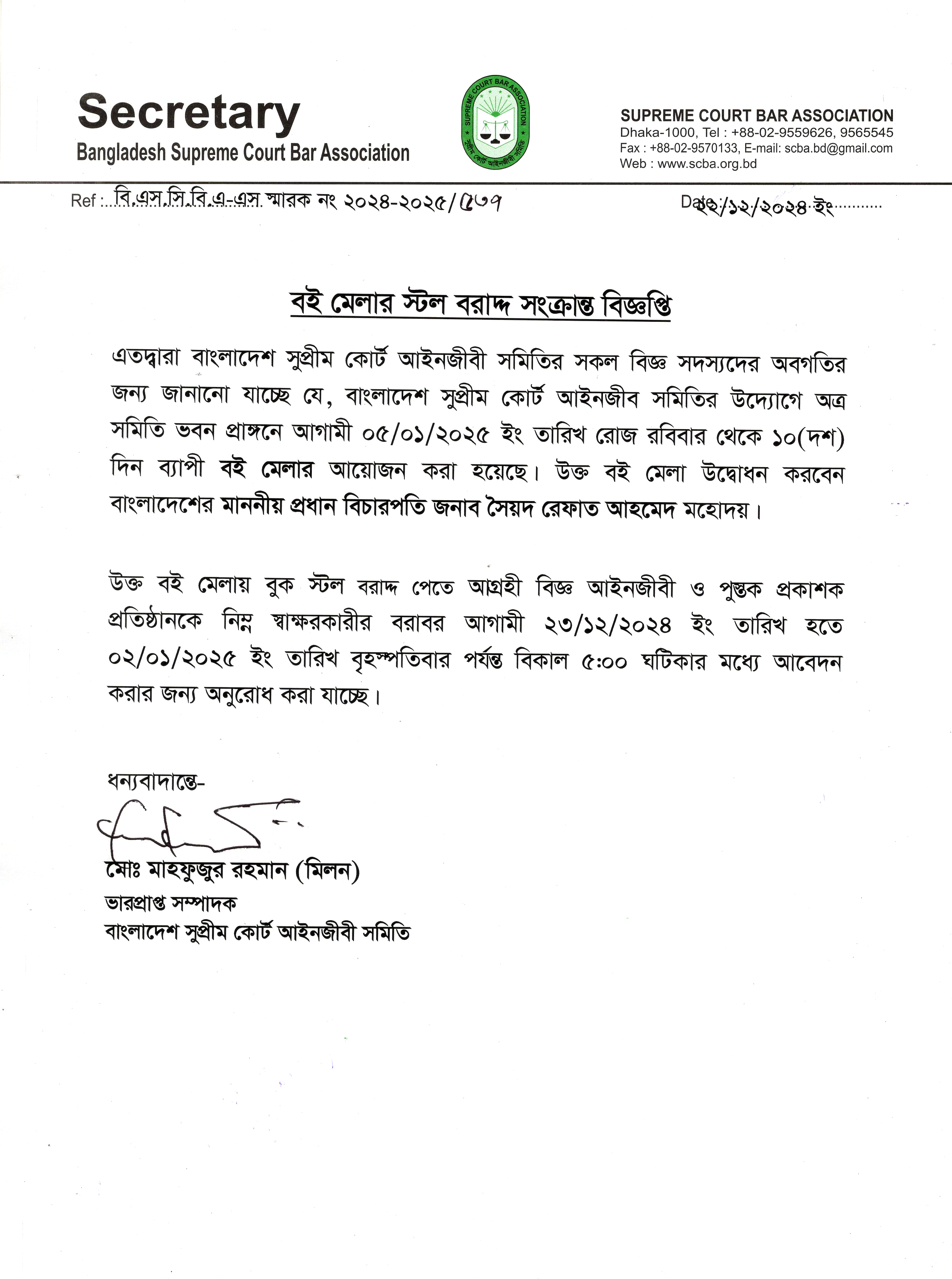 Message From the Secretary (Acting)It is a great pleasure on my part as Secretary, Bangladesh Supreme Court Bar Association to see the website. As an integral part of the Global Village we feel proud of being attached with the device..... Read More