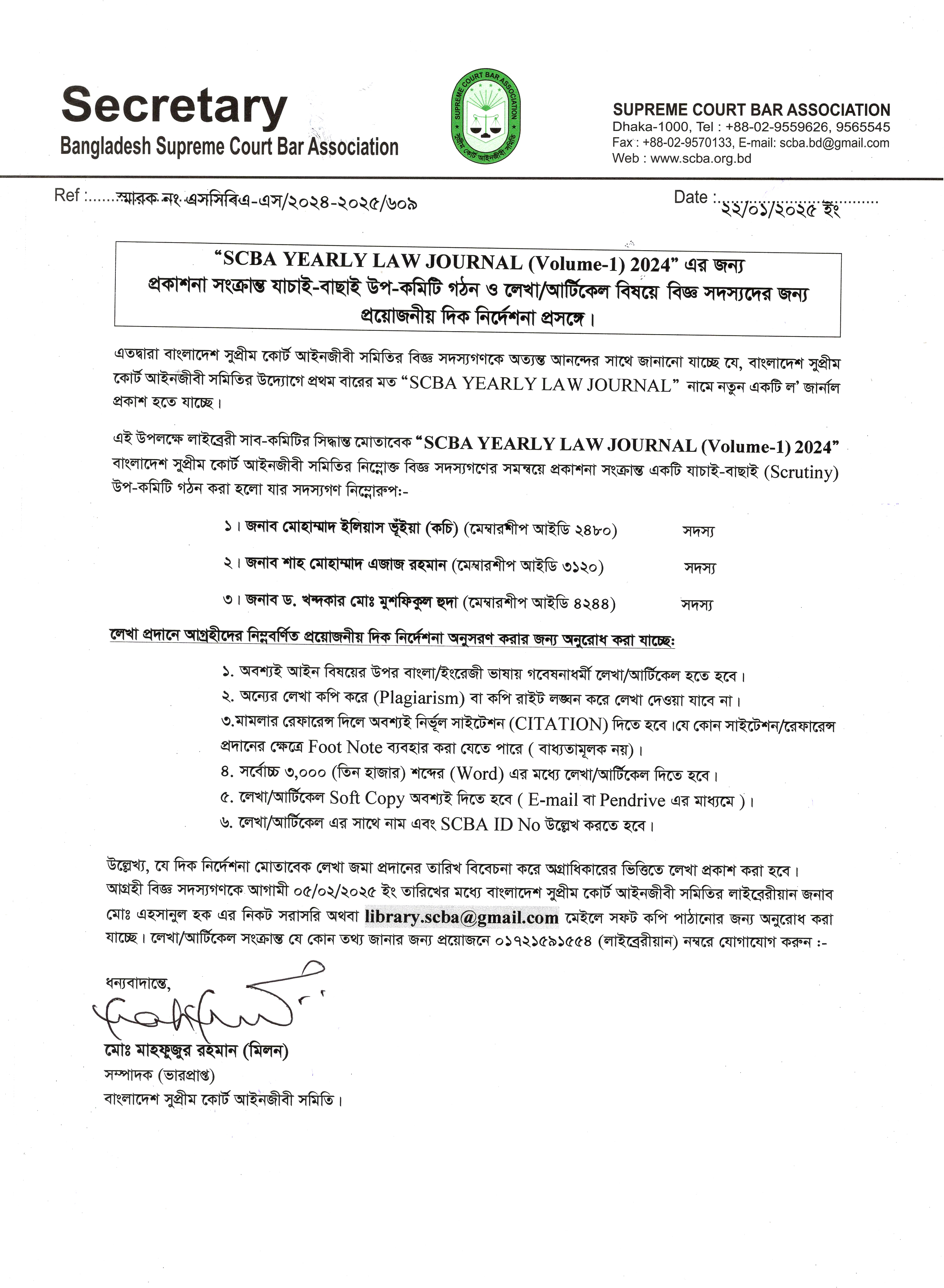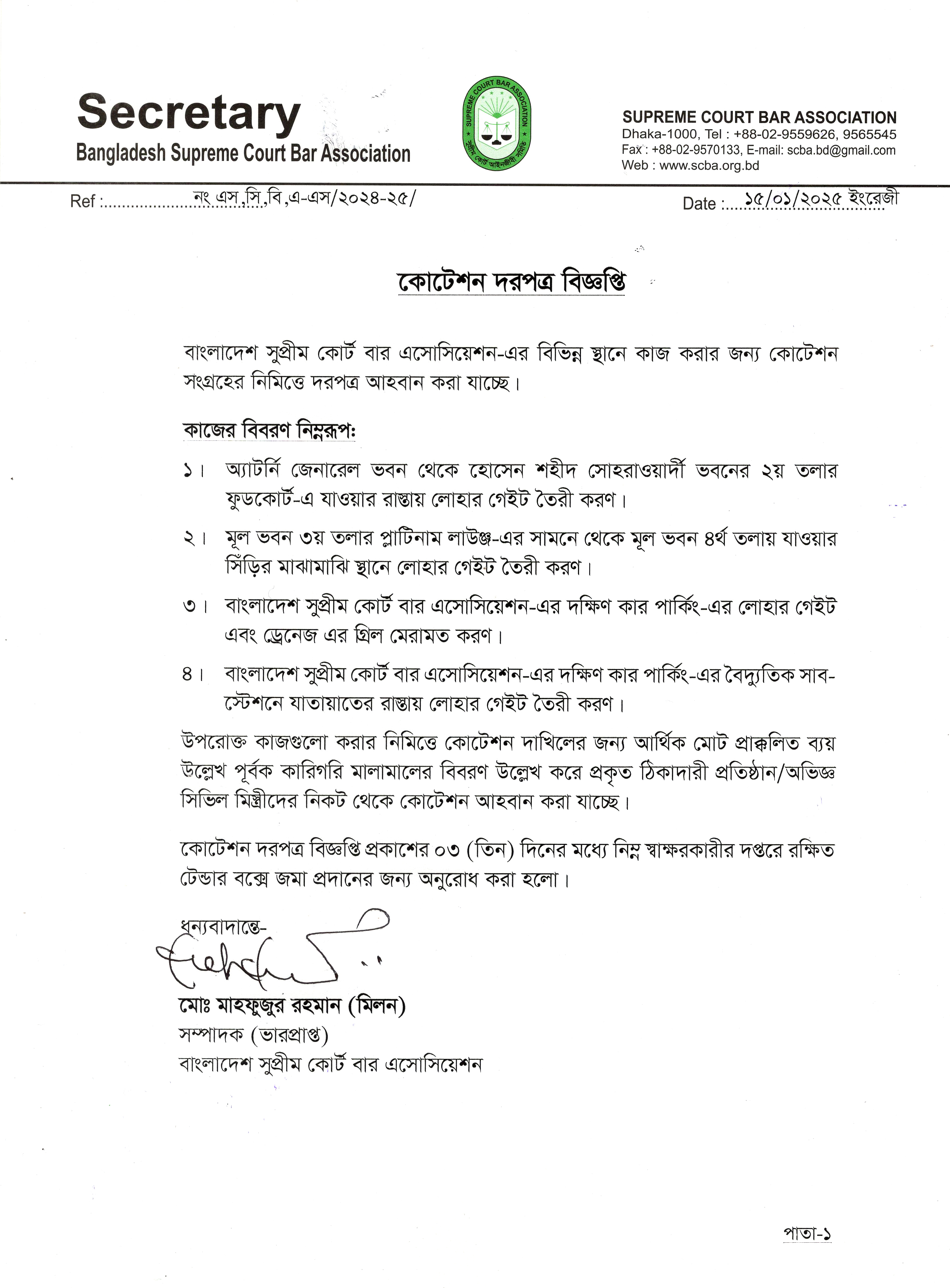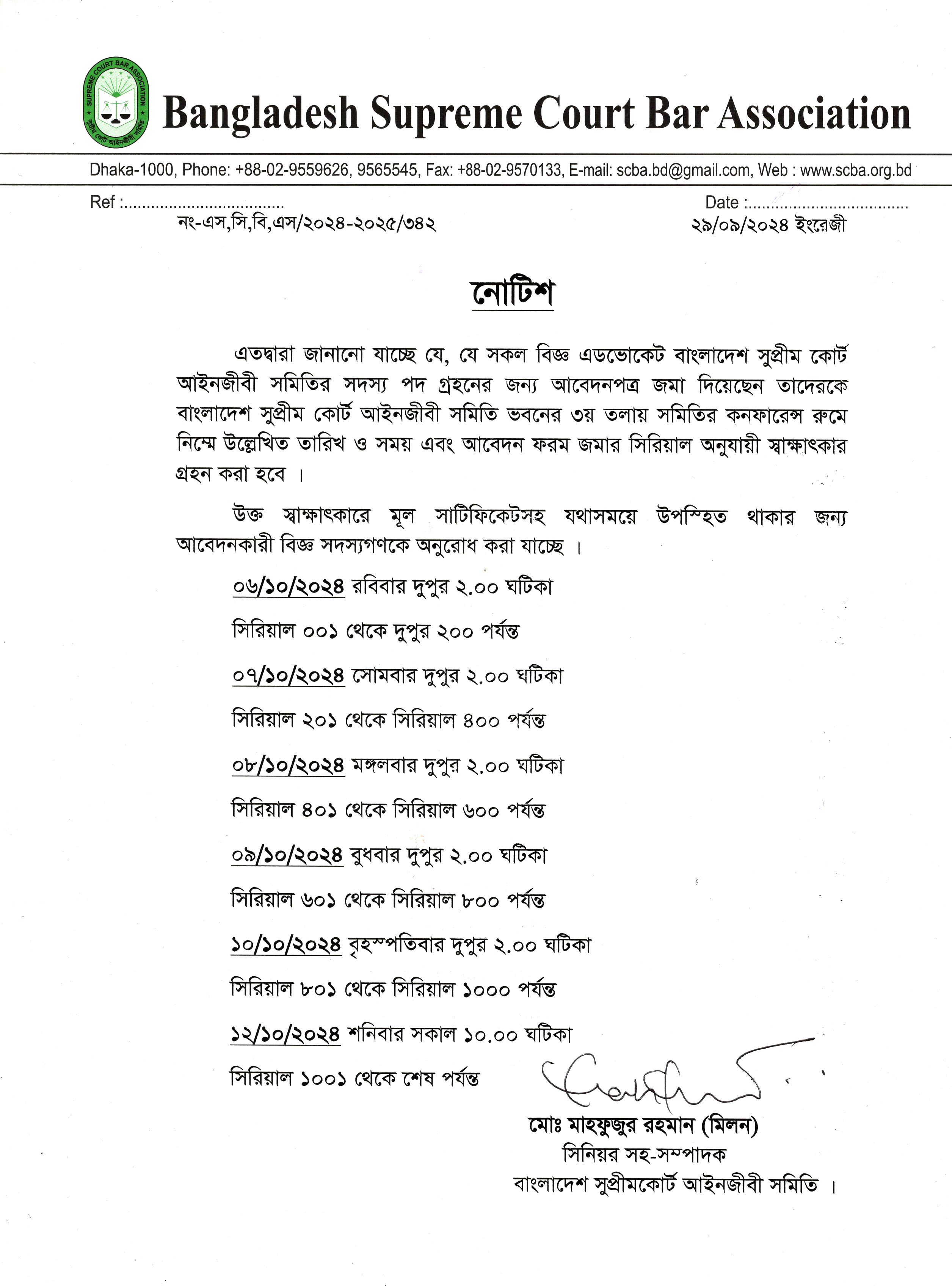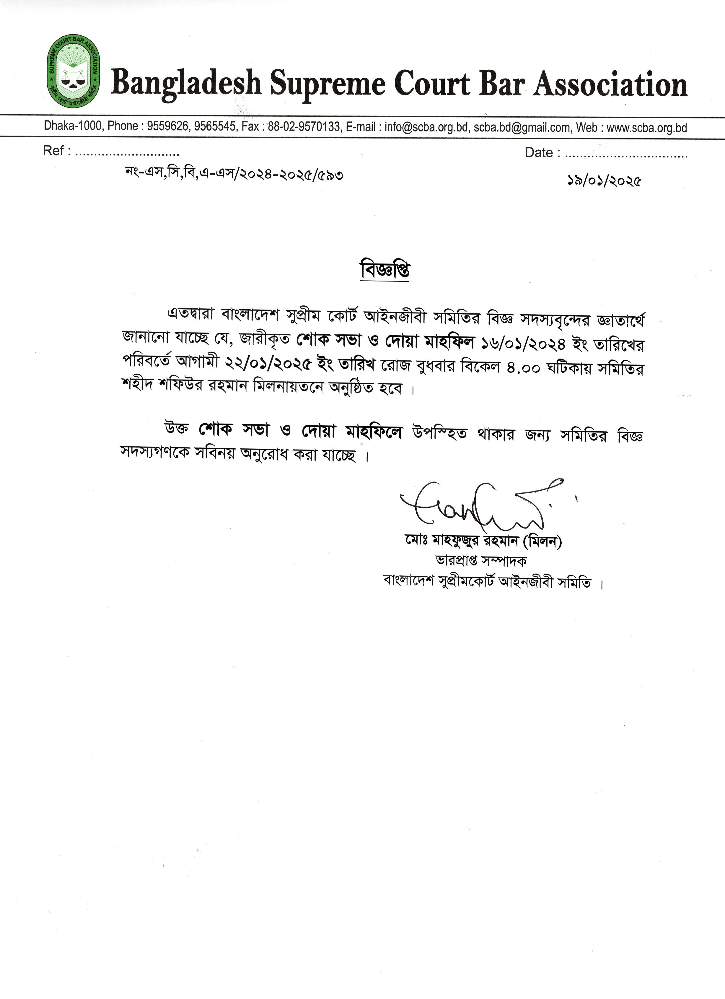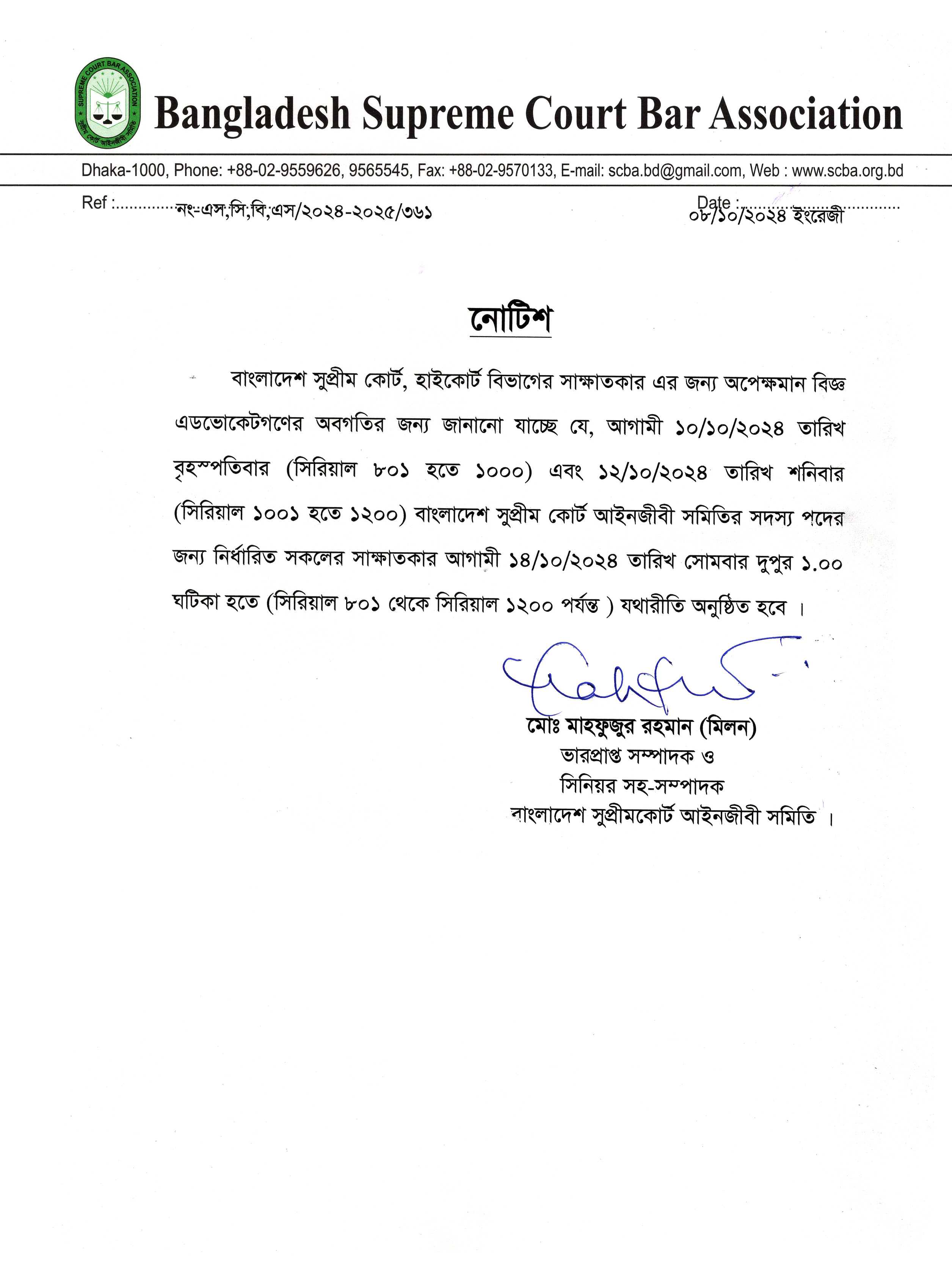 Message From the Secretary (Acting)It is a great pleasure on my part as Secretary, Bangladesh Supreme Court Bar Association to see the website. As an integral part of the Global Village we feel proud of being attached with the device..... Read More